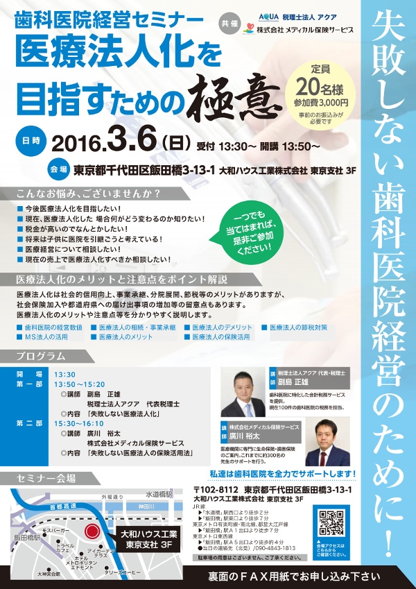 | 講師 | 税理士法人アクア 代表 税理士 副島 正雄 株式会社メディカル保険サービス 廣川 裕太 |